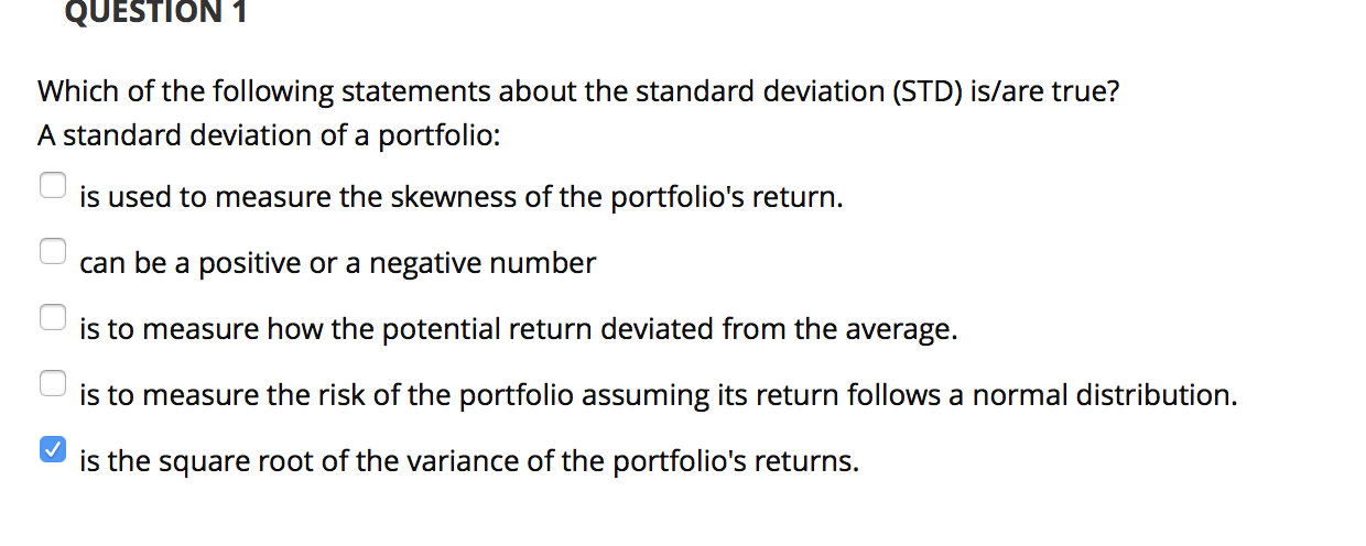 It deals with the average or center of location of the probability distribution. Interestingly standard deviation cannot be negative. Which of the following statements is true of a portfolios standard deviation.